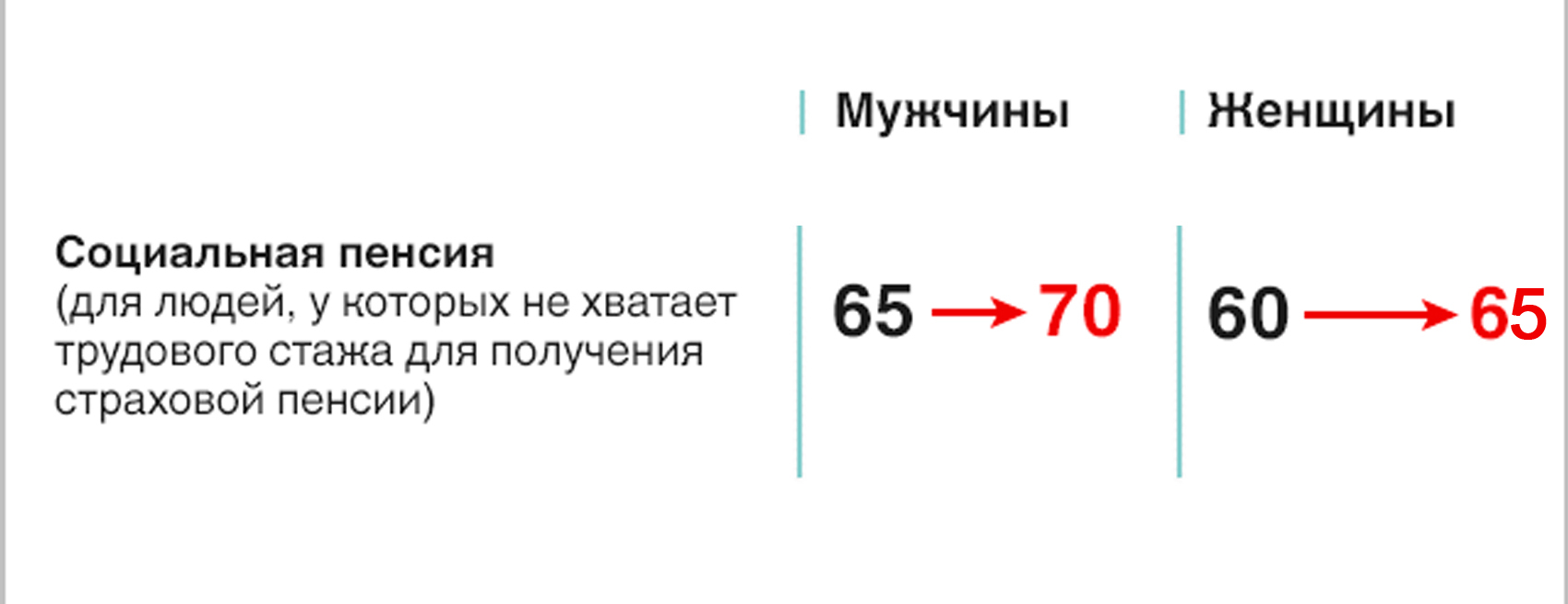 Закон предусматривает изменения, связанные с возрастом выхода на социальную пенсию. Гражданам, которые не работали или не приобрели полноценного стажа, необходимого для получения страховой пенсии, социальную пенсию будут назначать не в 60 (женщинам) и 65 лет (мужчинам), а в 65 и 70 лет соответственно.