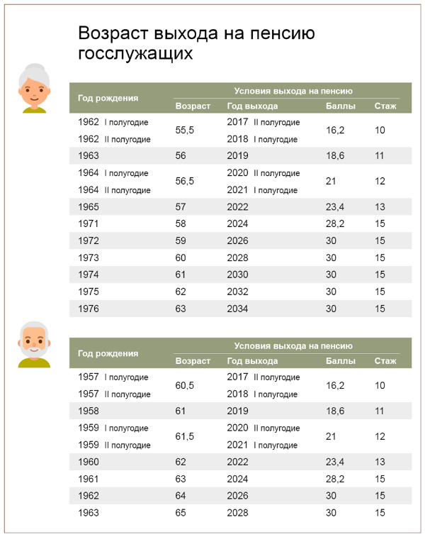 Льготный выход на пенсию также сохраняется у педагогов, врачей и представителей других профессий, которым выплаты назначаются не по достижении пенсионного возраста, а после приобретения необходимой выслуги лет. При этом с 2019 года назначение пенсии в таких случаях происходит с учетом переходного периода по повышению пенсионного возраста, который вступает в силу с момента приобретения необходимой выслуги лет по профессии. Например, школьный учитель, выработавший в апреле 2019-го необходимый педагогический стаж, сможет выйти на пенсию в соответствии с переходным периодом через шесть месяцев, в октябре 2019-го.